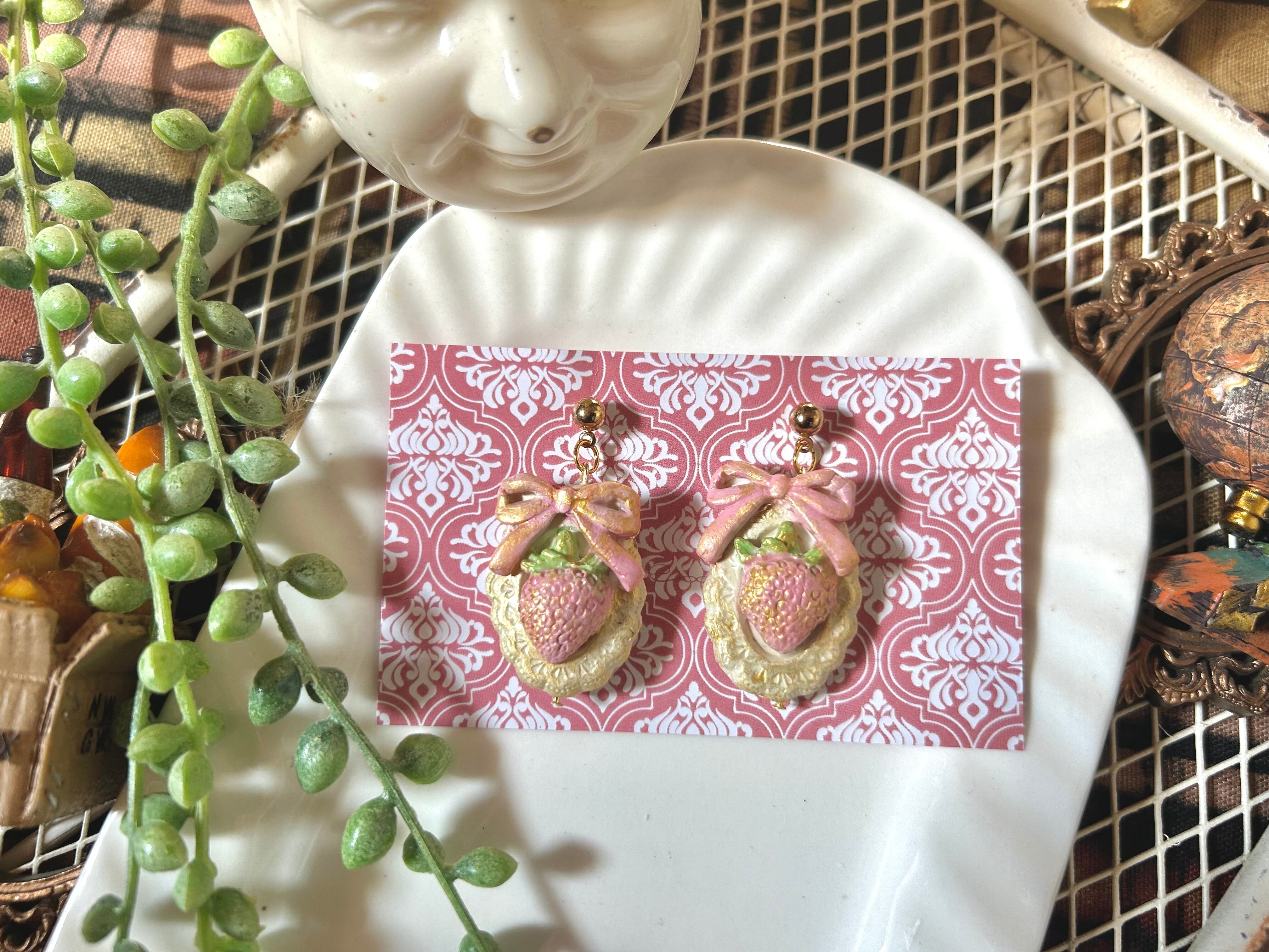 小さな額に添えられたイチゴが可愛らしいピアス(イヤリングにも変更できます。ピアスかイヤリングをご選択の上、ご購入ください)