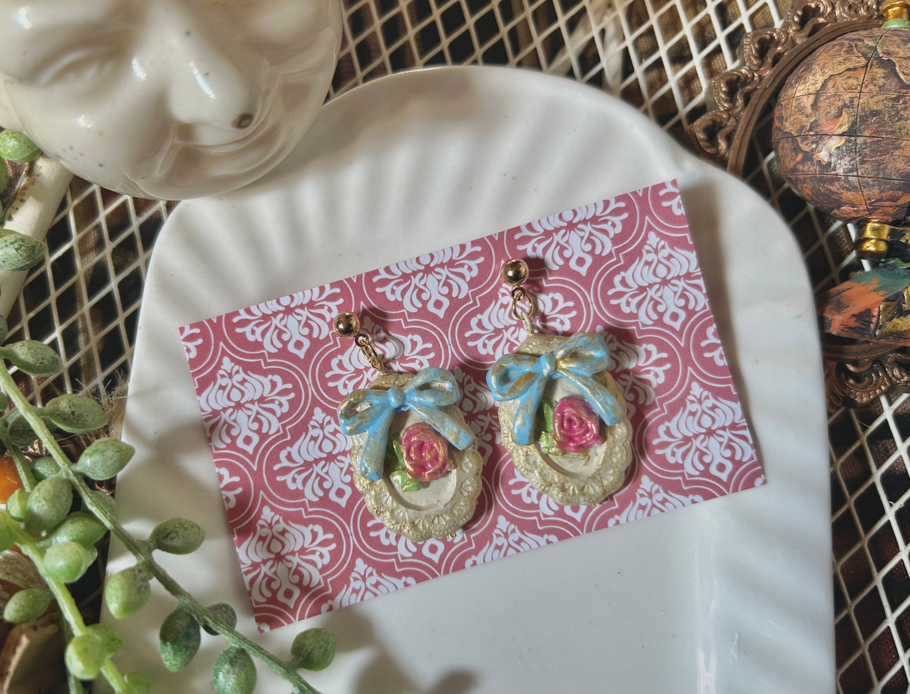 小さな額に添えられた薔薇が可愛らしいピアス(イヤリングにも変更できます。ピアスかイヤリングをご選択の上、ご購入ください)