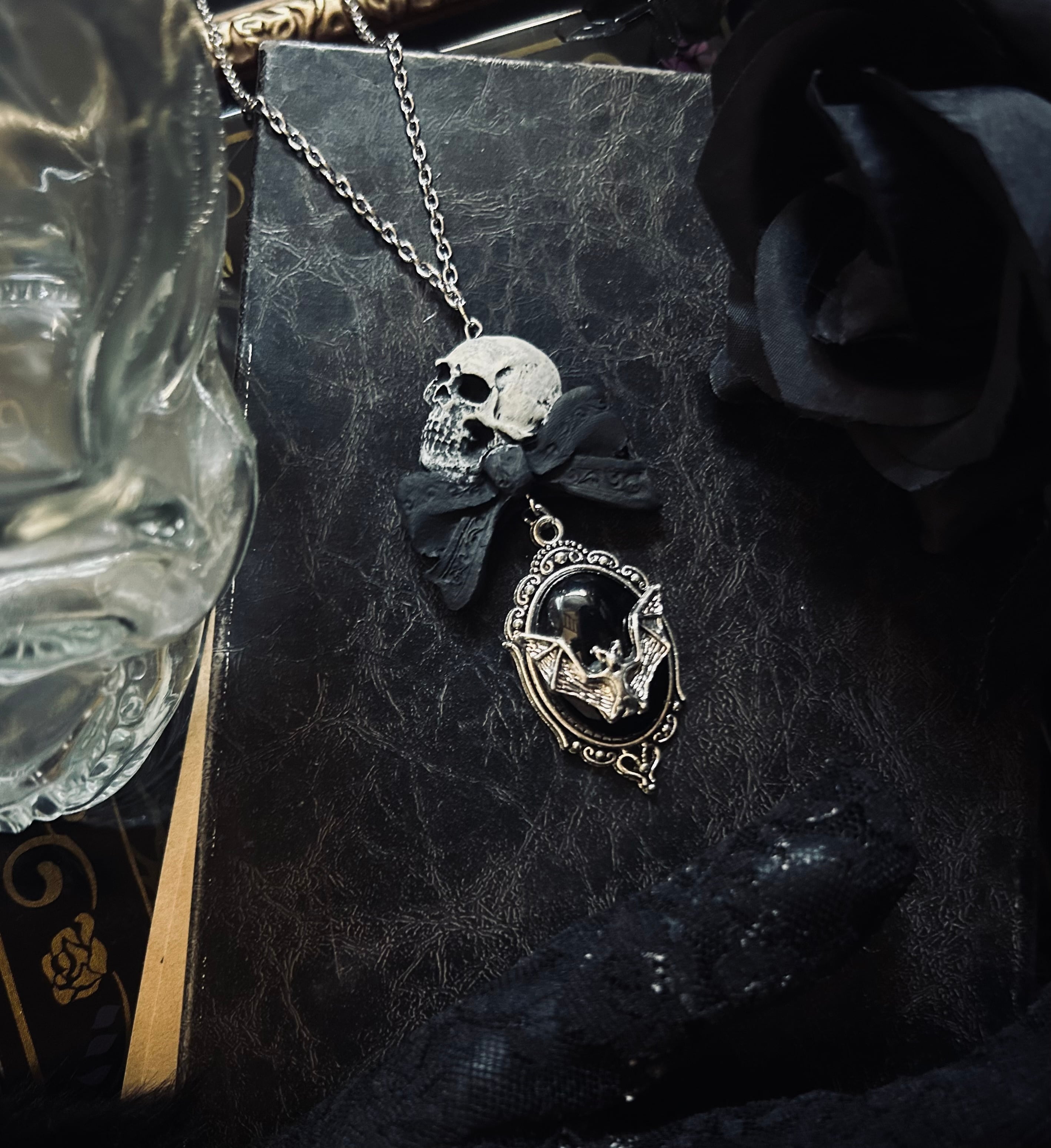 羽を広げたコウモリと共にリボンでおめかしをした頭蓋骨が添えられているネックレス