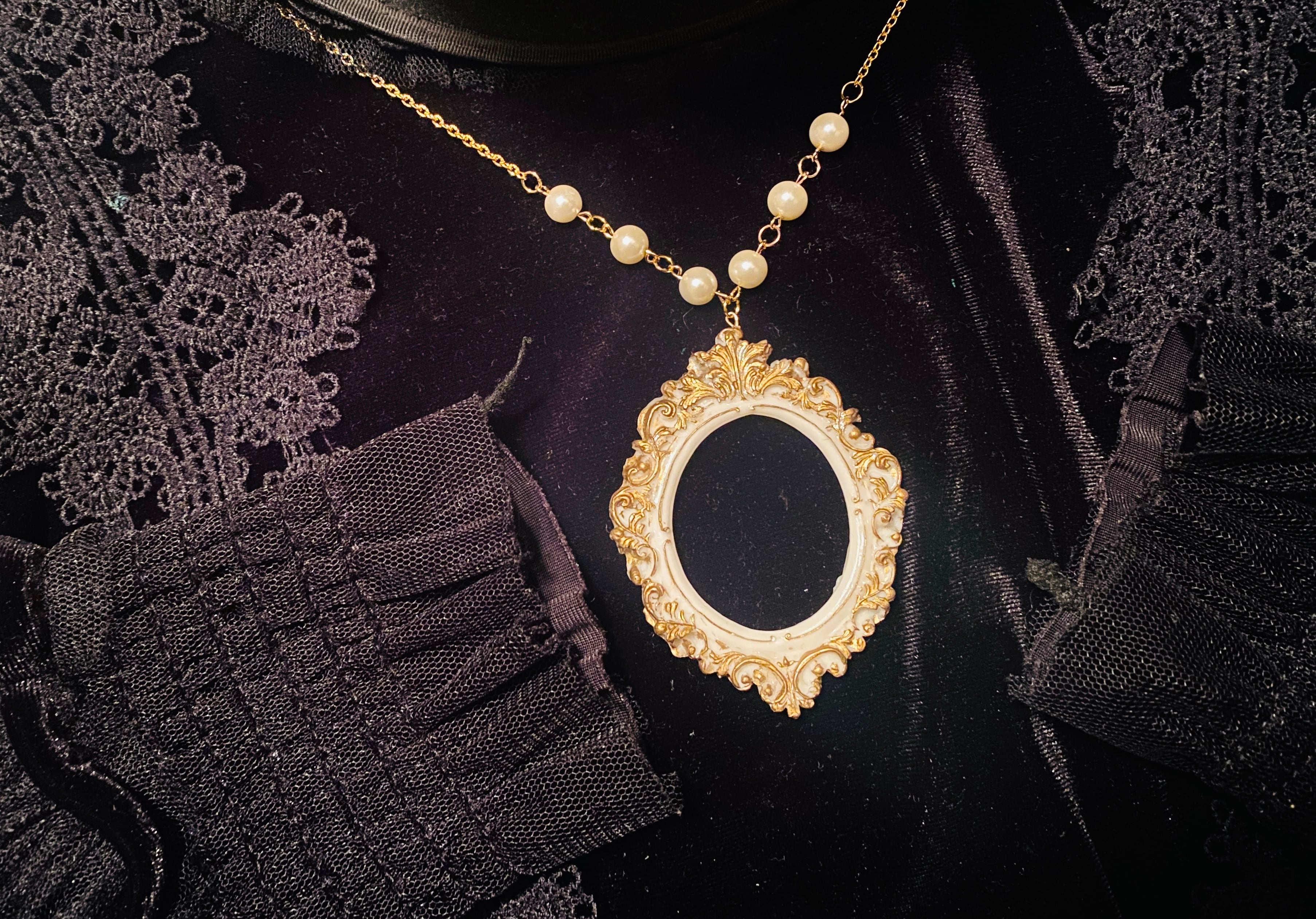 何も飾られていない額縁のネックレス。