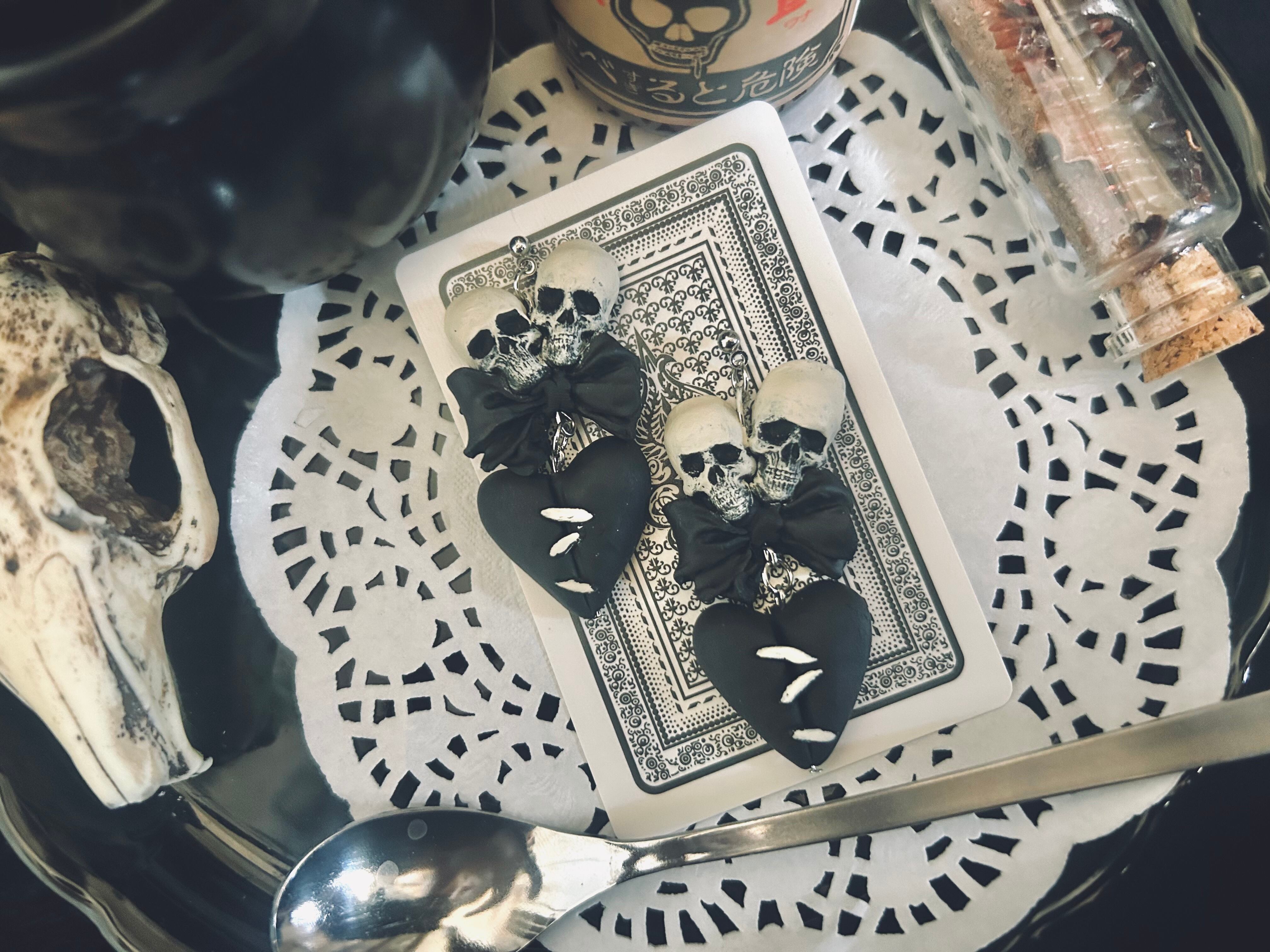 心臓が止まったばかりでもそれを縫い合わせて愛を確かめ合うかのように寄り添いあう2人のピアス