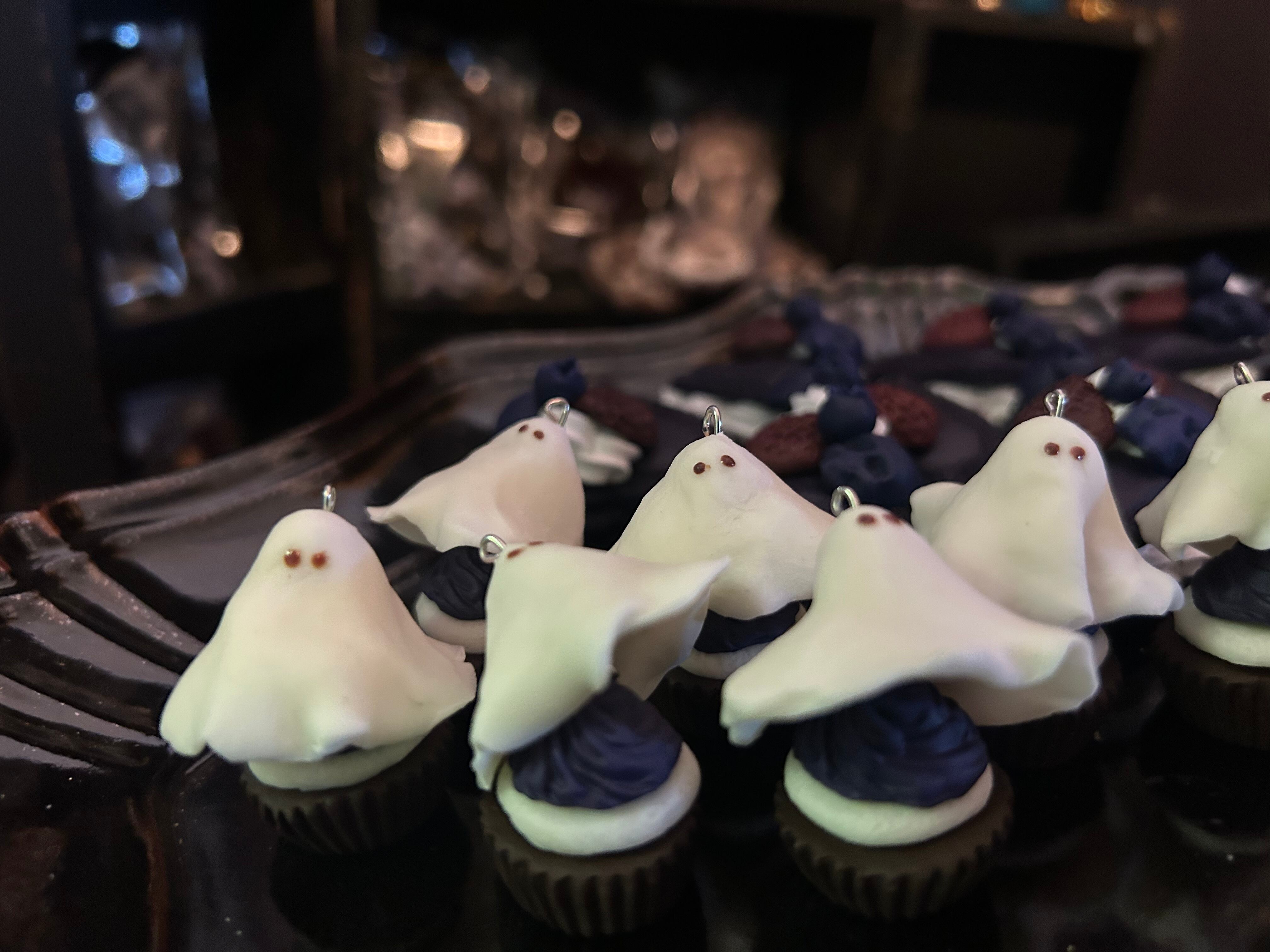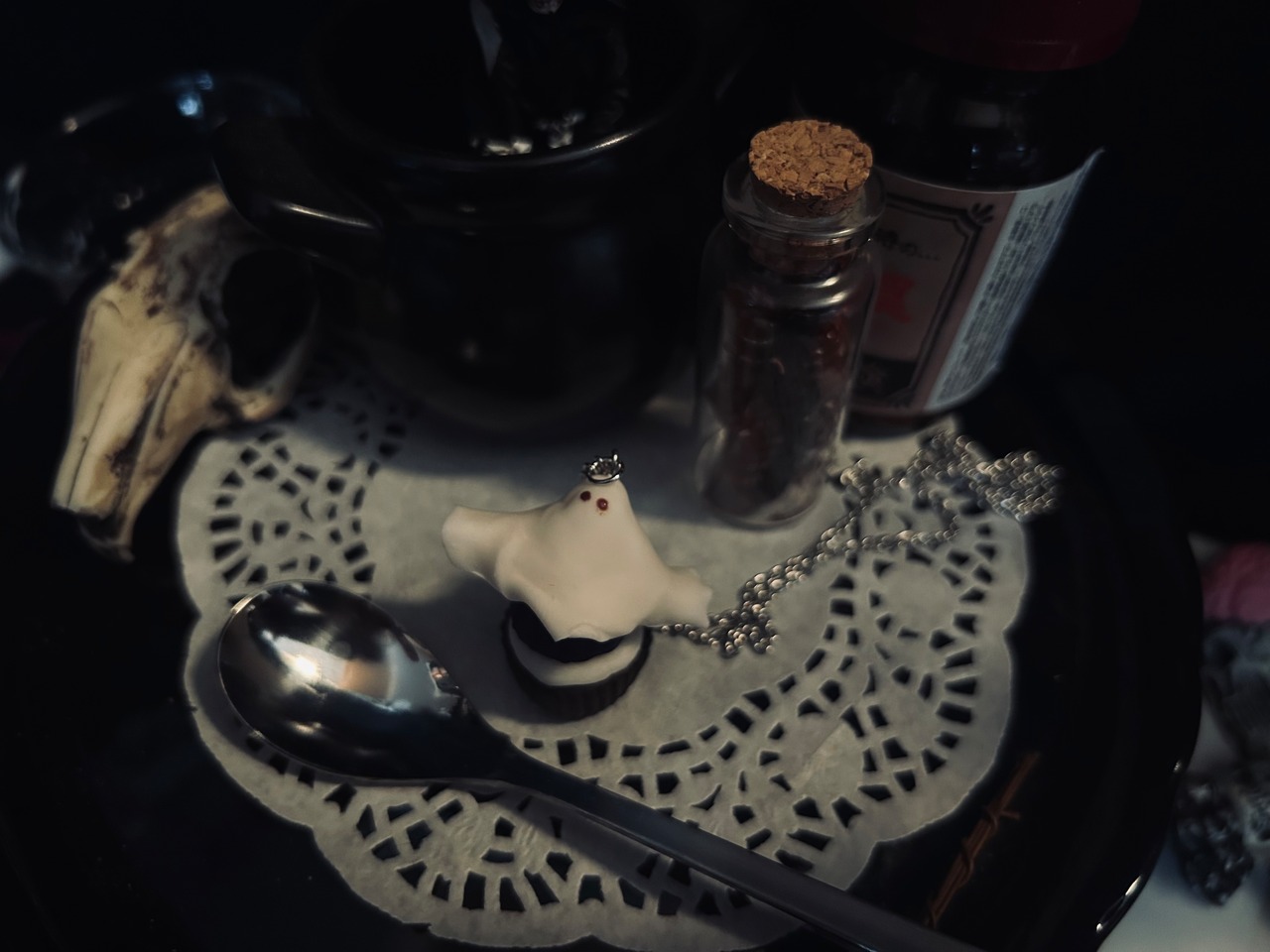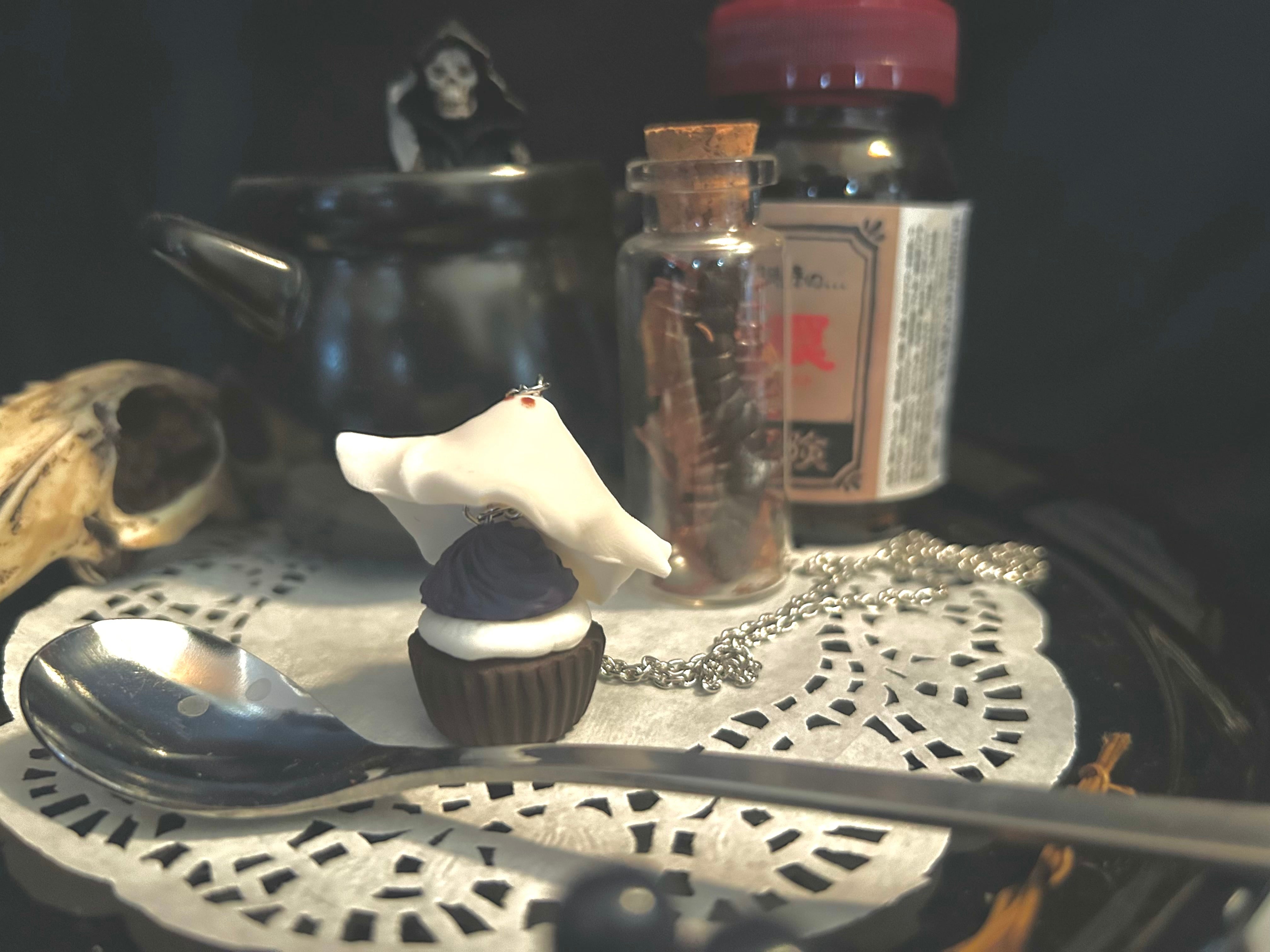 可愛らしいゴーストがゆらゆらと揺れながら紫芋ベースの美味しそうなカップケーキを揺らすネックレス。